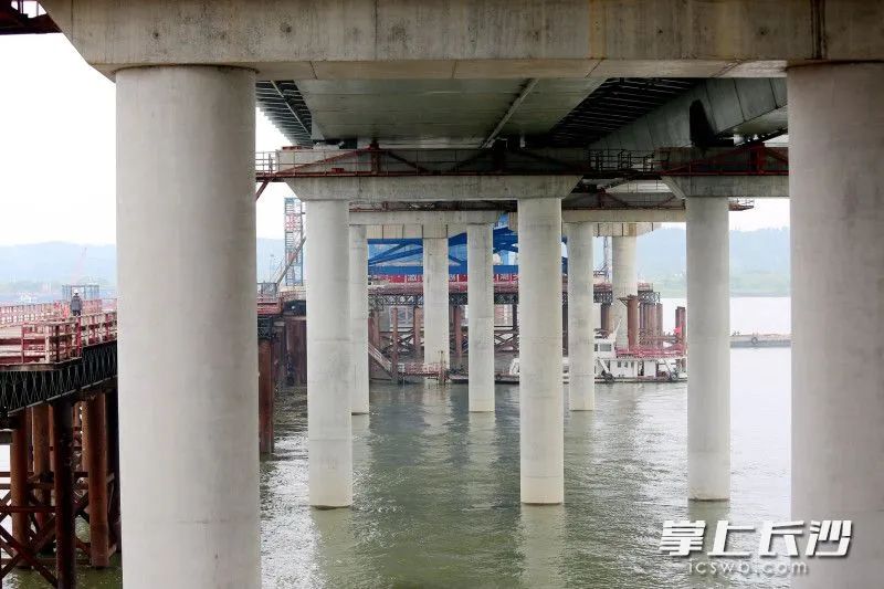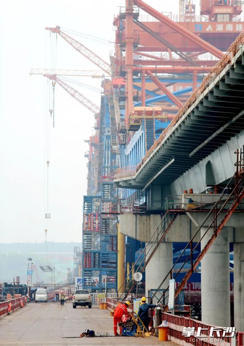 端午小长假期间,暮坪湘江特大桥建设工地施工忙。暮坪湘江特大桥桥梁全长3.928公里,预计今年10月合龙。
